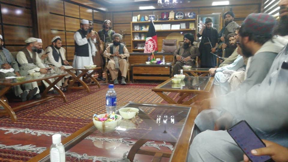 Această poză este extraordinară – telefoane occidentale, dulciuri, apă îmbuteliată – în cadrul întâlnirii în care guvernatorul Ziaulhaq Amarkhi predă oficial regiunea șeicului taliban Nida Muhammad, guvernator al emiratului islamic pentru Nangarhar. O întâlnire în care unii stau cu ochii în telefoane, alții discută, nimic agresiv, zici că este o predare de proiect.