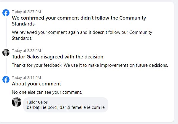 Am luat un zucc de 24 de ore fiindcă am postat un comentariu pe care boții Facebook l-au considerat ca fiind nepotrivit. El arată astfel: